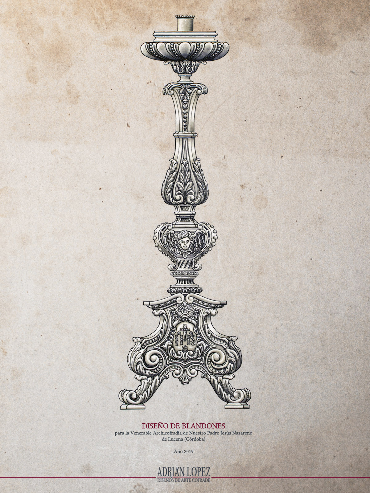 El pasado año 2019 recibí, por parte del taller de Paula Orfebres, el encargo de realizar el diseño de cuatro nuevos blandones de cultos para la Venerable Archicofradía de Nuestro Padre Jesús Nazareno de Lucena, una corporación histórica, de entre las más señeras y con mayor historia de esta localidad cordobesa, cuyo Titular es una de las Sagradas Imágenes más veneradas de toda la Semana Santa lucentina. Así pues, se trataba de crear unas piezas muy importantes dentro del ajuar litúrgico de esta cofradía, que pudieran ocupar una posición relevante en cualquier montaje de priostía destinado a realzar a la portentosa imagen tardogótica del Nazareno durante los solemnes cultos en su honor, pero que también pudieran servir, en un momento dado, para exornar el baldaquino en el que ordinariamente se le rinde culto. En este sentido, era especialmente importante para mí aportar a la traza de estos candelabros, aparte de una personalidad propia, la elegancia y distinción que, desde mi punto de vista, debe ser la seña de identidad de una Hermandad histórica, como la comitente. Pero, al mismo tiempo, quería que los blandones quedasen perfectamente integrados con el entorno arquitectónico y cultual en el que van a figurar, de modo que estuviesen en sintonía con la Capilla de Nuestro Padre Jesús Nazareno, interesante obra arquitectónica levantada en estilo neoclásico en 1758, y cuyas trazas se deben a Vicente del Castillo y Andrés Cordón.