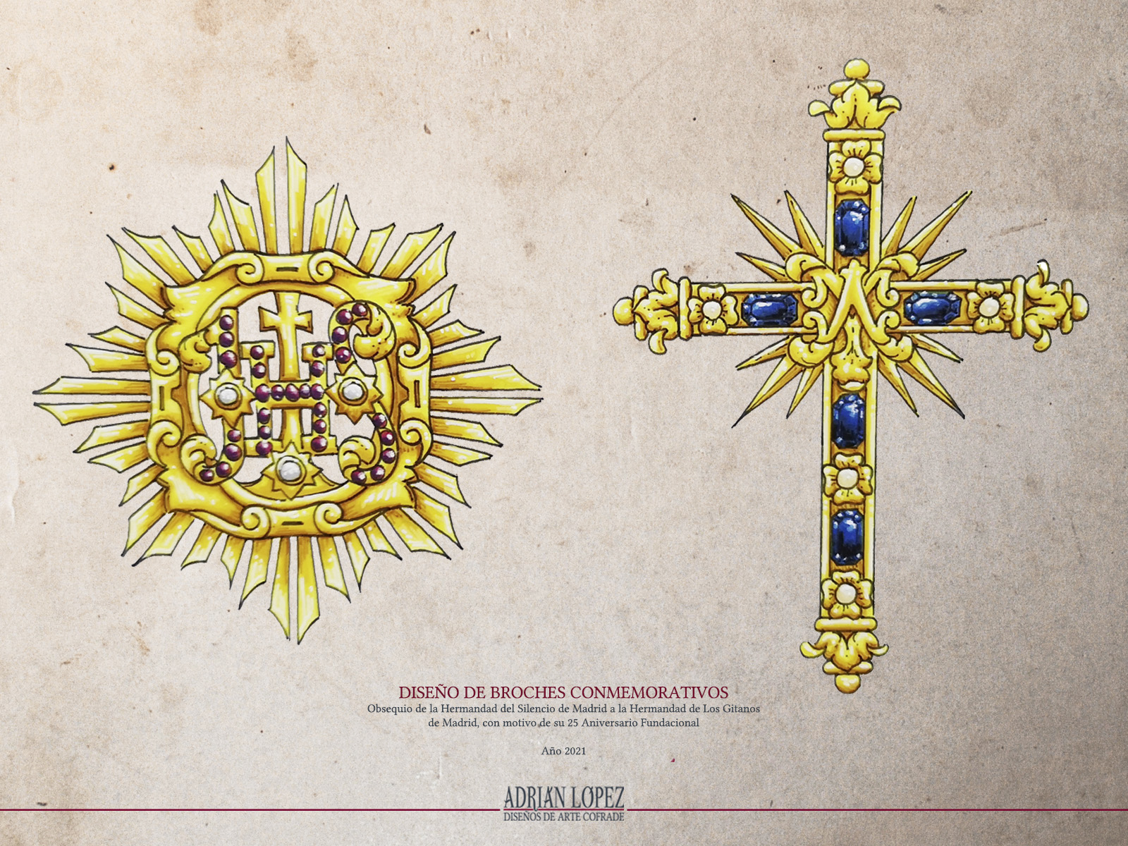 El año 2021 fue un año muy especial e importante para la Hermandad Sacramental y Carmelitana de los Gitanos de Madrid, pues, a lo largo del mismo, celebraba su 25 Aniversario Fundacional. Con motivo de este acontecimiento, mi querida Hermandad del Silencio, que está unida por estrechos vínculos fraternales a la corporación del Miércoles Santo desde su creación, quiso tener un detalle con ella; un regalo para sus Sagrados Titulares que, precisamente, diese testimonio físico de la especial unión entre ambas Hermandades. En consecuencia, se me encargó el diseño de un broche pasador para la Sagrada Imagen de Nuestro Padre Jesús de la Salud, y una cruz pectoral para la de María Santísima de las Angustias, otorgándome así el inmenso honor de plasmar en este proyecto no sólo esa singular fraternidad, ese hermanamiento oficioso que, como digo, existe entre ambas cofradías matritenses, sino también la importancia del acontecimiento que se conmemora con dichas piezas, nada más y nada menos que las bodas de plata de la cofradía carmelitana.