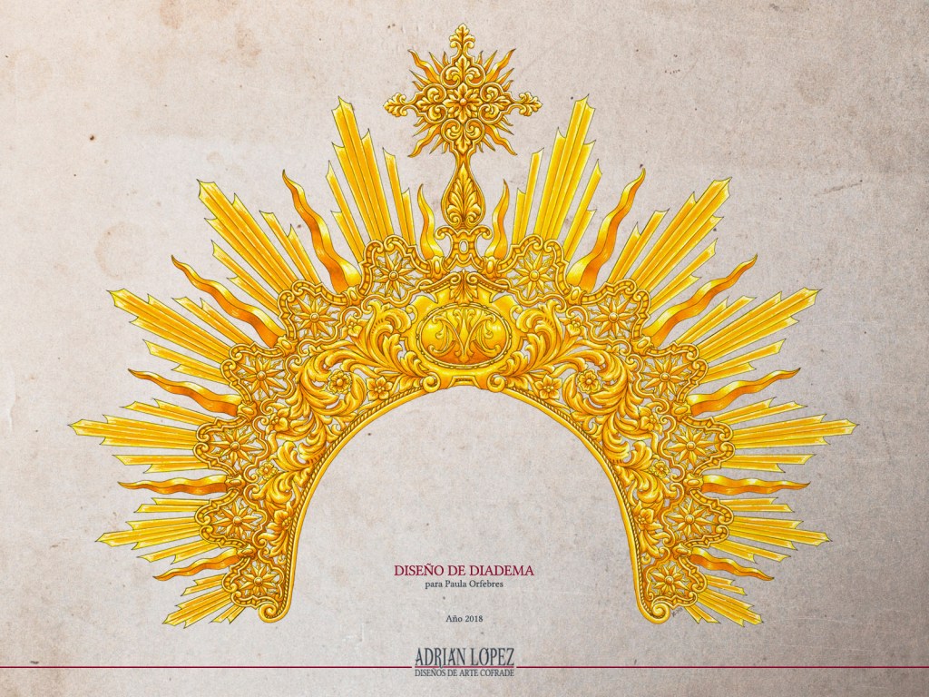 En el año 2018, tras una primera colaboración, recibí un segundo encargo por parte del prestigioso obrador lucentino de Paula Orfebres: la ejecución de un diseño de diadema para dolorosa con la intención inicial de disponer de un diseño de autor, exclusivo, dentro de su catálogo, del que se pudieran llevar a cabo algunas reproducciones muy contadas. De este modo, a fin de poder satisfacer los requerimientos de distintos tipos de clientes y poder amoldarse a dolorosas muy diferentes, el diseño debía manifestar un compromiso entre clasicismo y modernidad dentro de este tipo de piezas. El encargo fue muy importante para mí, pues se trataba de la primera presea que dibujaba, y es la primera diadema que he tenido ocasión de diseñar hasta la fecha.