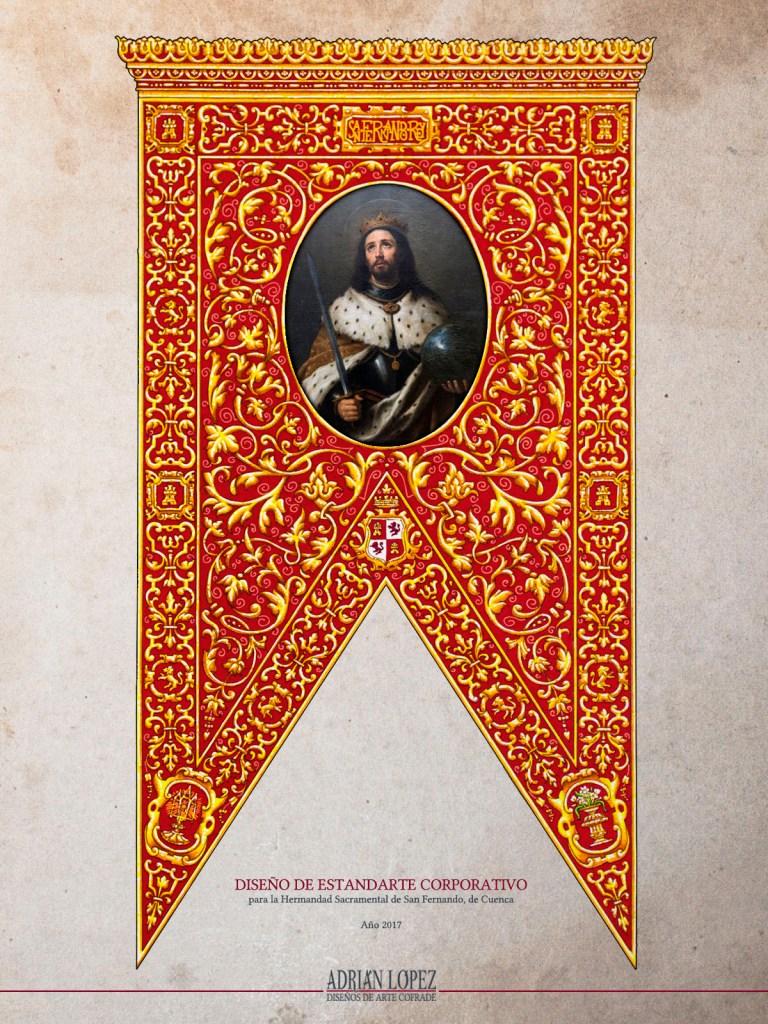 Durante el otoño de 2016 recibí el encargo de realizar el diseño y la ejecución, en la técnica de pintura en tela, del estandarte corporativo de la Hermandad de San Fernando de Cuenca, una corporación gloriosa de reciente creación, promovida e impulsada por un grupo de jóvenes cofrades con mucha ilusión y unas ganas enormes de sortear las carencias, sobre todo de recursos, que siempre plantea la fundación de una nueva hermandad, y más aún si es de Gloria, en una ciudad como Cuenca, cuya devoción se vuelca mucho hacia la Semana Santa, dejando un tanto de lado el resto del año litúrgico. Los miembros de la Junta de Gobierno de la Hermandad me hicieron hincapié en que querían una insignia de calidad, trabajada y con sentido; y que solamente me pedían que no fuera un guión (la forma tradicional de las insignias corporativas en la ciudad) sino un estandarte con una efigie de San Fernando en el centro, y en el que figurase alguna alusión a las dos grandes devociones del Rey Santo: el Santísimo Sacramento y la Purísima Concepción de la Virgen María.