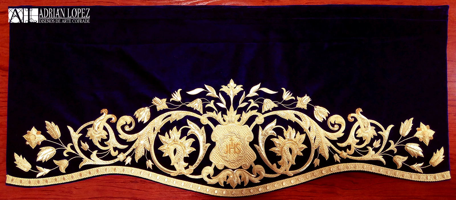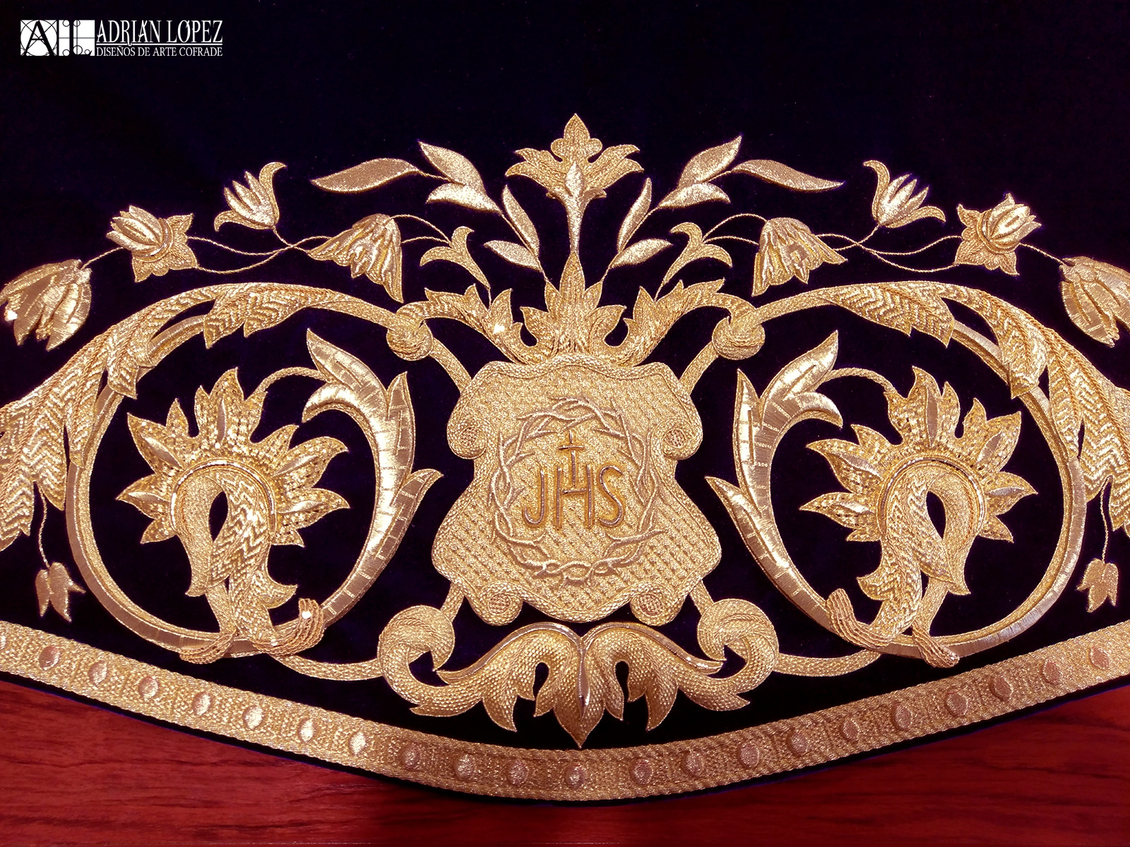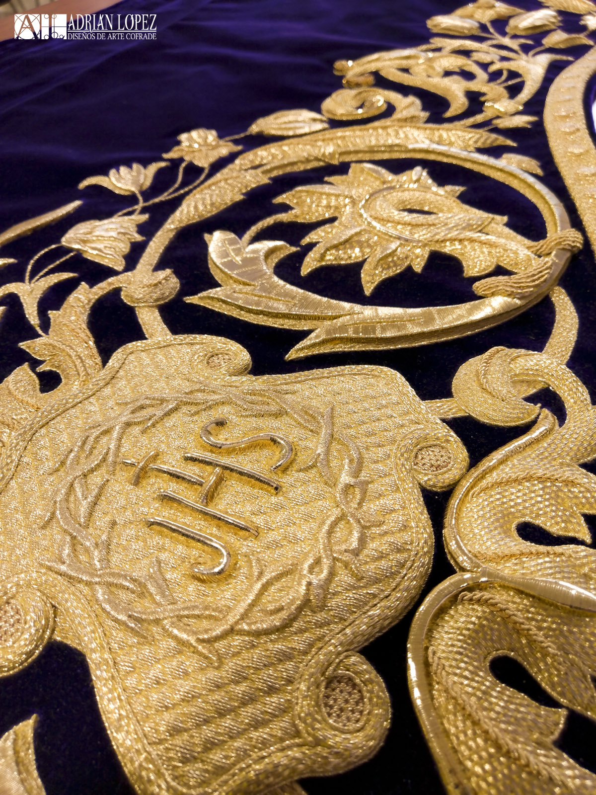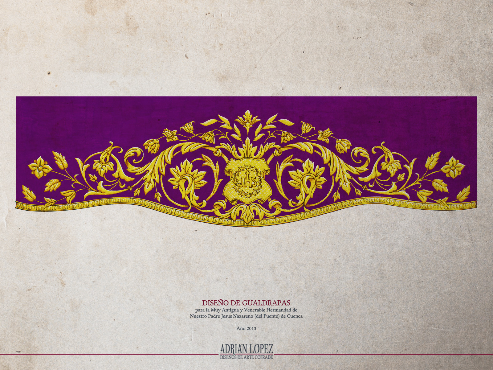 Este diseño es el primero de cierta entidad que realicé, allá por el año 2013. Tiene un gran valor sentimental para mí no sólo por esta circunstancia, sino porque, además, el encargo me lo realizó mi gran amigo y enorme cofrade Iván López Ayllón, para la que es su hermandad desde la cuna: la Muy Antigua y Venerable Hermandad de Nuestro Padre Jesús Nazareno (del Puente), corporación clásica y señera de la Semana Santa de Cuenca que realiza su desfile en la tarde del Jueves Santo. La idea era realizar unas nuevas gualdrapas para el paso más reciente de la corporación, el del Auxilio de Nuestro Señor Jesucristo, hermoso misterio realizado por el imaginero murciano José Antonio Hernández Navarro.
