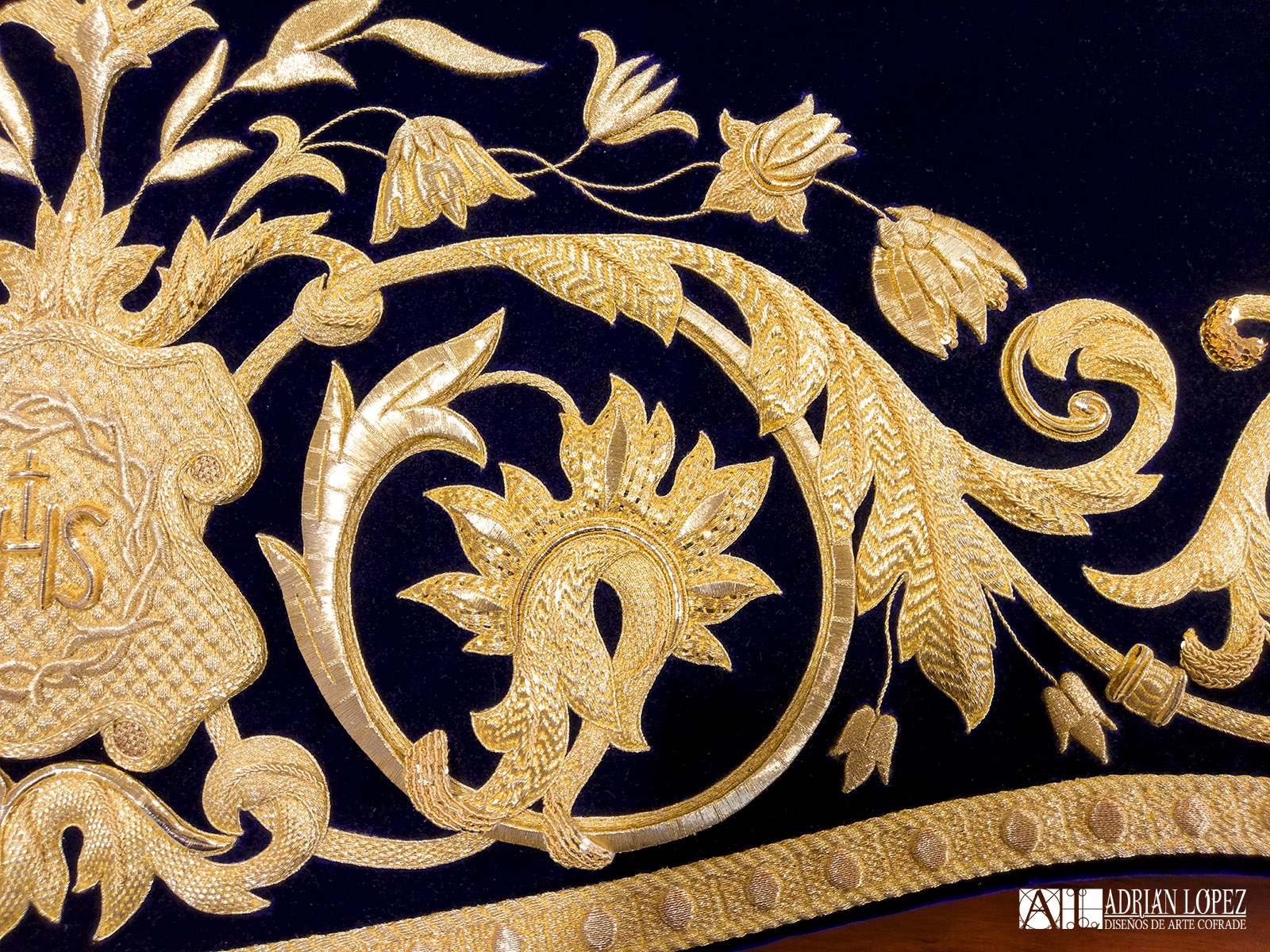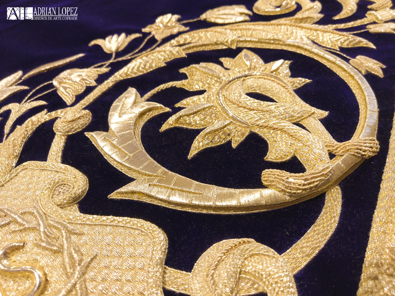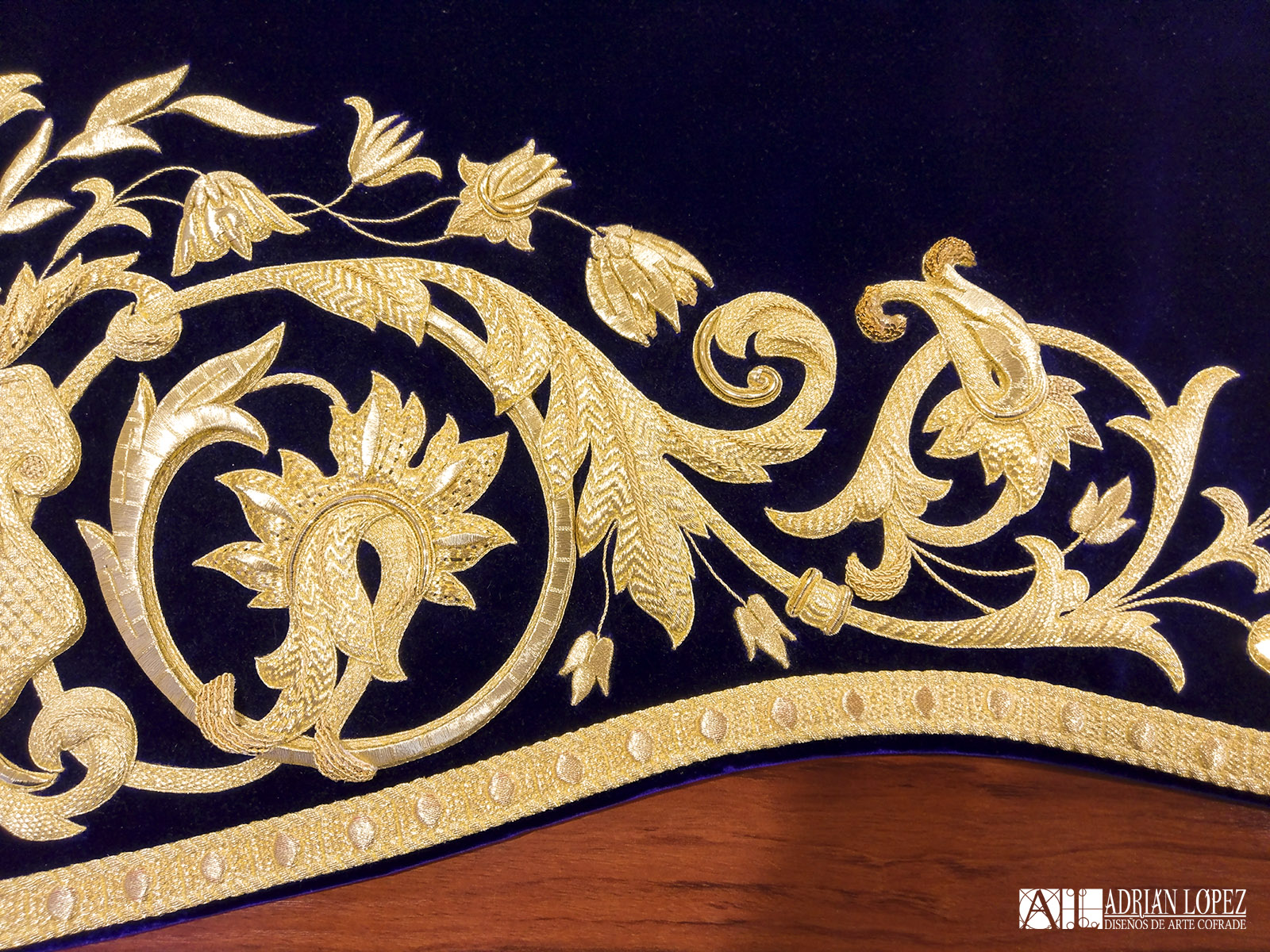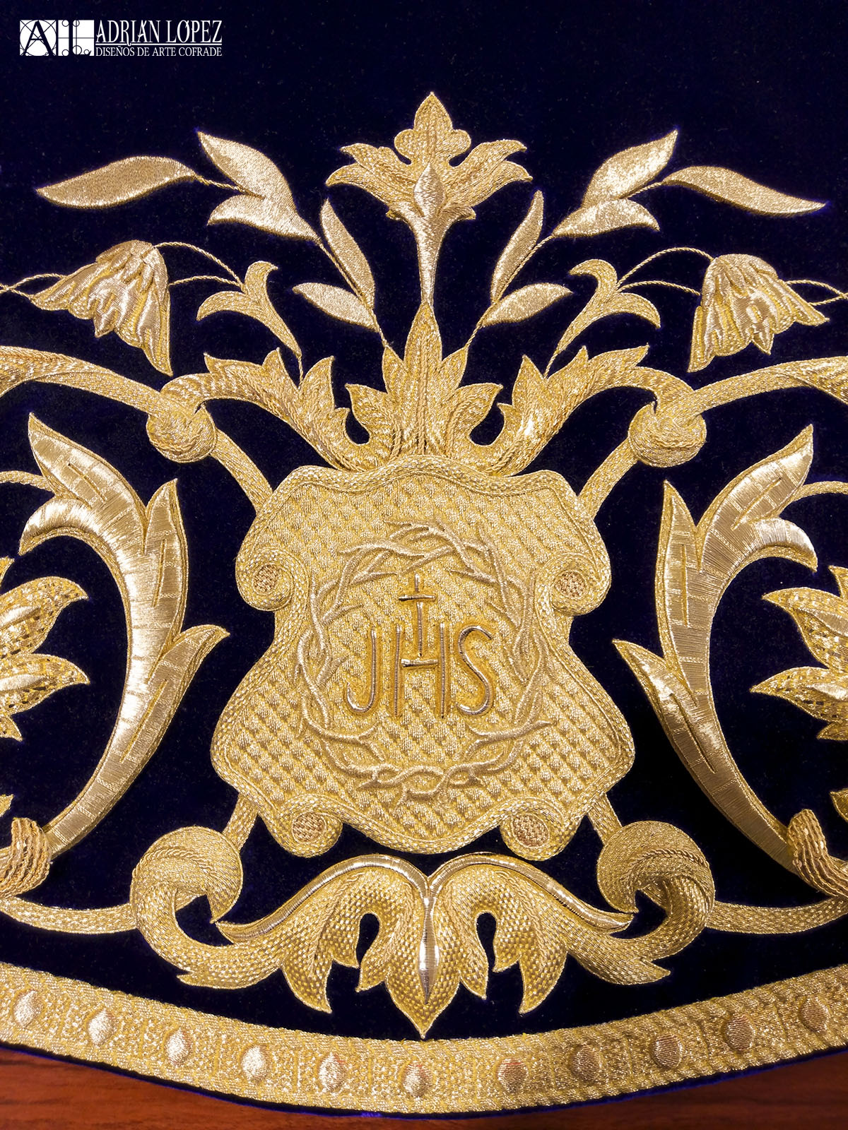 Este diseño es el primero de cierta entidad que realicé, allá por el año 2013. Tiene un gran valor sentimental para mí no sólo por esta circunstancia, sino porque, además, el encargo me lo realizó mi gran amigo y enorme cofrade Iván López Ayllón, para la que es su hermandad desde la cuna: la Muy Antigua y Venerable Hermandad de Nuestro Padre Jesús Nazareno (del Puente), corporación clásica y señera de la Semana Santa de Cuenca que realiza su desfile en la tarde del Jueves Santo. La idea era realizar unas nuevas gualdrapas para el paso más reciente de la corporación, el del Auxilio de Nuestro Señor Jesucristo, hermoso misterio realizado por el imaginero murciano José Antonio Hernández Navarro.