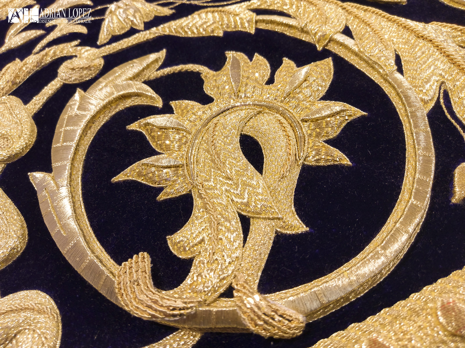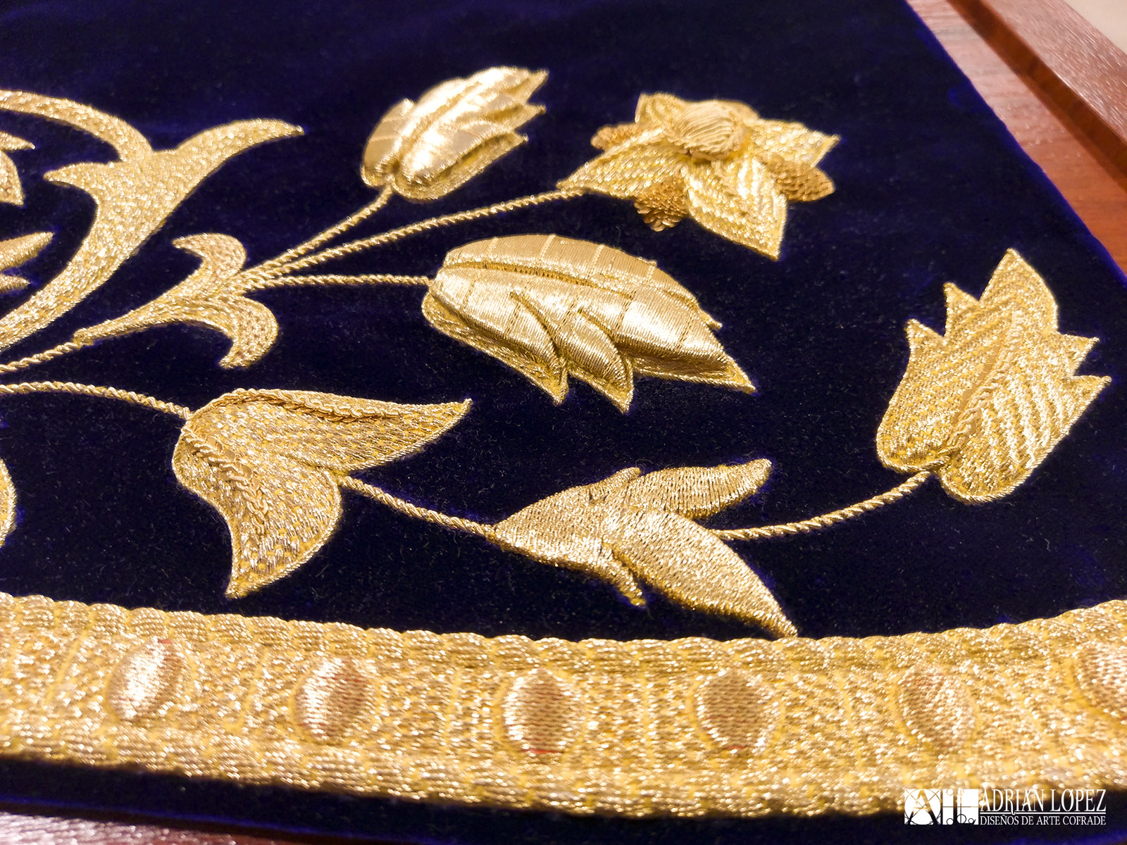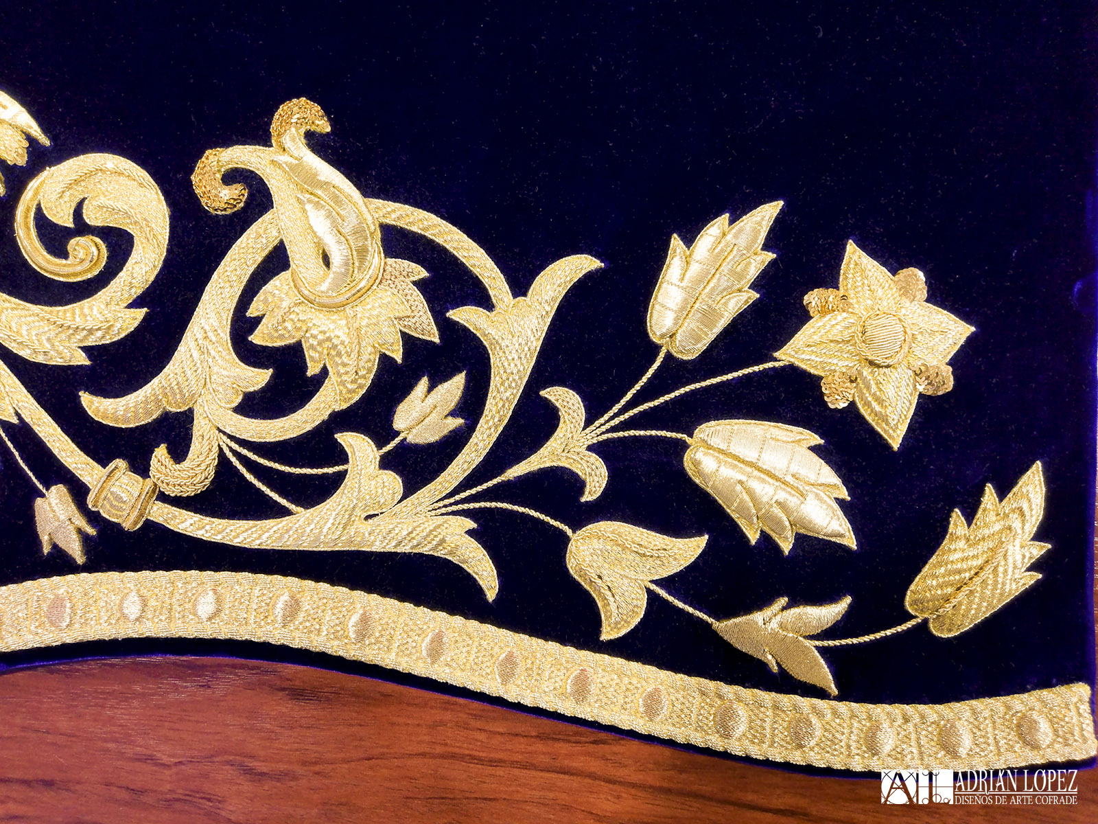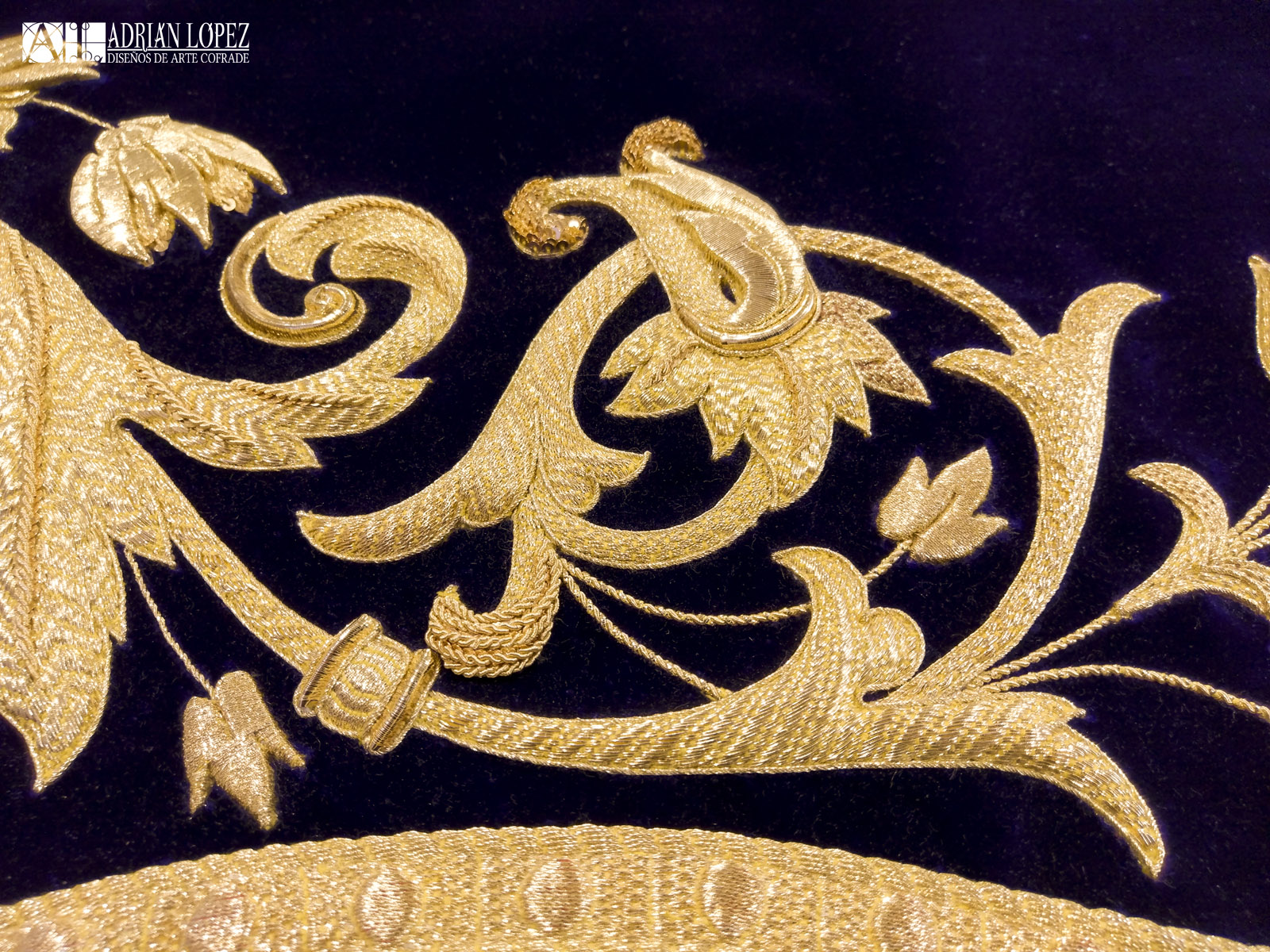 Este diseño es el primero de cierta entidad que realicé, allá por el año 2013. Tiene un gran valor sentimental para mí no sólo por esta circunstancia, sino porque, además, el encargo me lo realizó mi gran amigo y enorme cofrade Iván López Ayllón, para la que es su hermandad desde la cuna: la Muy Antigua y Venerable Hermandad de Nuestro Padre Jesús Nazareno (del Puente), corporación clásica y señera de la Semana Santa de Cuenca que realiza su desfile en la tarde del Jueves Santo. La idea era realizar unas nuevas gualdrapas para el paso más reciente de la corporación, el del Auxilio de Nuestro Señor Jesucristo, hermoso misterio realizado por el imaginero murciano José Antonio Hernández Navarro.