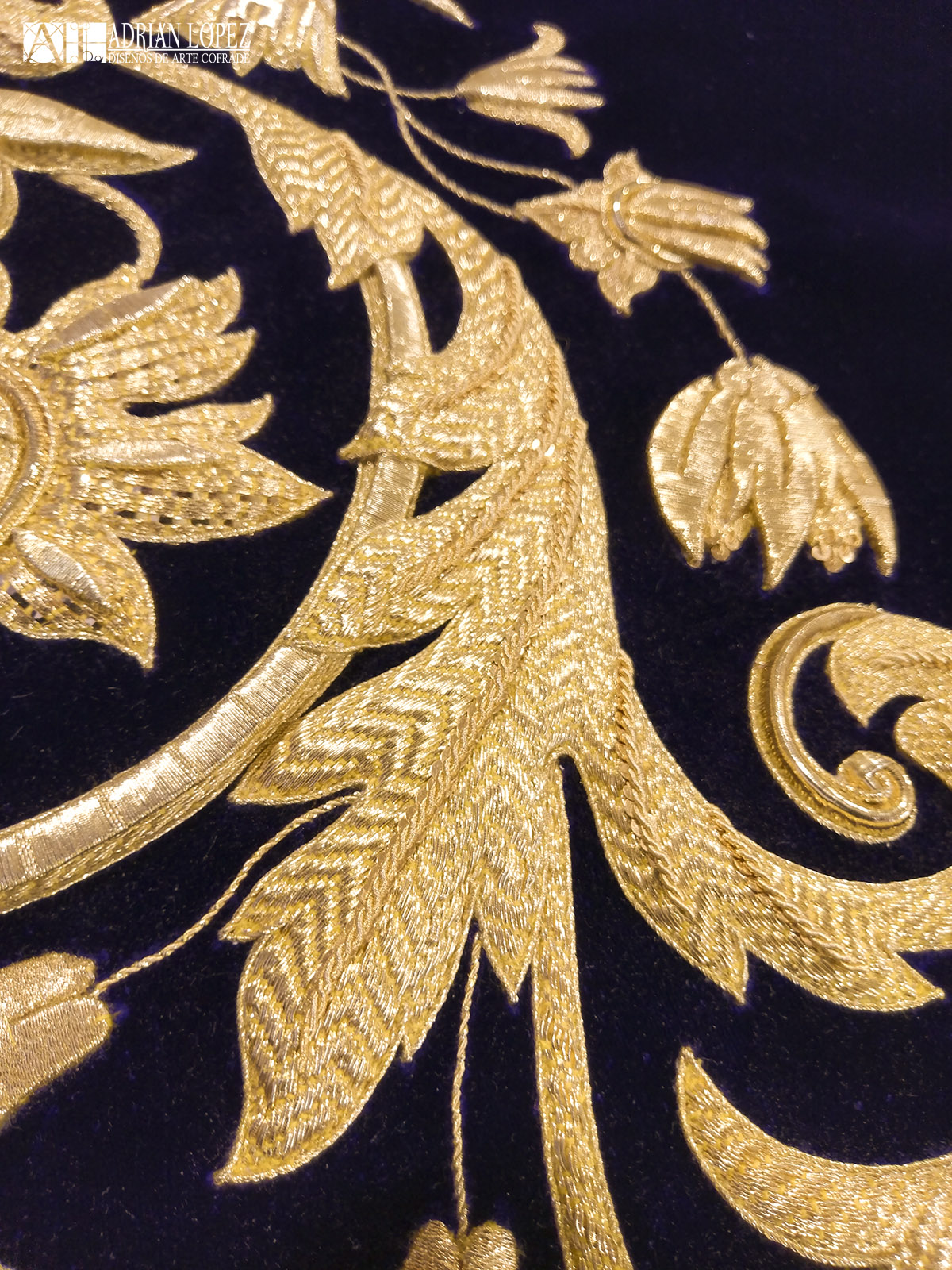 Como las andas de los dos pasos que tiene la Hermandad, diseñadas por el arquitecto conquense Francisco León Meler, son prácticamente minimalistas, y presentan una ausencia casi total de decoración, era difícil encontrar un referente estético claro para plantear el ornamento de las gualdrapas, así que decidí realizar un diseño sencillo y elegante, sin pretensiones simbólicas y de corte más bien clásico, basado en el elemento distintivo de los dos conjuntos: la línea curva. La composición es limpia y equilibrada, y la idea es que se ejecute con un bordado fino, sin grandes volúmenes. En el centro de la pieza figura el escudo de la Hermandad, con hojas de acanto encima y debajo. A ambos lados del mismo se disponen dos zarcillos con hojas de acanto y carnosas flores que se van enroscando en círculos de ritmo alterno y terminan en ramilletes de hojas con una pequeña flor cada uno, que ocupan los extremos de la pieza. Por encima de este motivo, brotando desde la hoja de acanto que se sitúa sobre el escudo, se disponen unos tallos muy finos en forma de abanico, con diversas flores y hojas de pequeño tamaño, de manera que los más externos se van enroscando hacia los laterales. En general, el diseño recuerda a los bordados castellanos de los siglos XVIII y XIX, especialmente a una variedad que buscaba cierta simplicidad y recordaba vagamente el estilo del Renacimiento, al tiempo que huía de los grandes volúmenes implementados en el Barroco y que estaban alcanzando grandes cotas de fantasía, en ese mismo siglo XIX, en Andalucía. La pieza se remata con un galón, trazando una curva moderada y clara, que quiere armonizar con el sinuoso pero contenido dibujo de las andas. No contemplé como necesaria la inclusión de fleco, precisamente para armonizar con el trazado limpio que presenta la arquitectura de las andas de ambos pasos de la Hermandad, aunque sí es posible optar por ella, si se quiere dar mayor sensación de movimiento a la pieza.