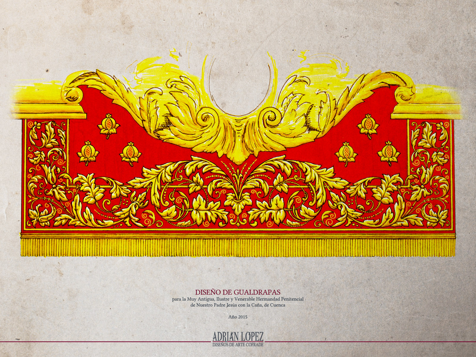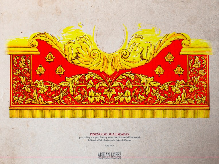 A finales del año 2014 recibí el encargo de realizar el diseño de unas nuevas gualdrapas para la Muy Antigua, Ilustre y Venerable Hermandad de Nuestro Padre Jesús con la Caña de Cuenca, a través de su Junta de Diputación, que me dio libertad absoluta para plantear la obra como mejor me pareciera. Como se explica en otra entrada, las gualdrapas son un elemento típico de la Semana Santa de Cuenca que cumple una función parecida a la de los faldones en los pasos de carga interna: ocultar el interior del paso. En este caso, al ir los cargadores dispuestos en dos varas o banzos a ambos lados del paso, el espacio del centro de las andas queda despejado y las gualdrapas vienen a tapar el armazón interno de las mismas, cuya visión es sumamente antiestética.
