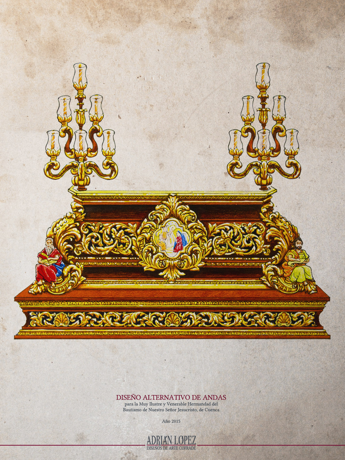A comienzos del año 2015 la Venerable Hermandad del Bautismo de Nuestro Señor Jesucristo, de Cuenca, se encontraba a punto de comenzar un proceso de renovación de sus andas procesionales. Aunque la corporación tenía en su poder un espectacular diseño del autor de sus Sagradas Imágenes, el imaginero y diseñador sevillano Antonio Joaquín Dubé de Luque, varios miembros de la comisión encargada de gestionar el proyecto se pusieron en contacto conmigo para que plantease una propuesta alternativa, que solamente sería valorada en caso de que el boceto de Dubé no fuera del agrado de los hermanos o que no aprobasen su ejecución por el elevado coste que implicaba. La idea que me trasladaron no era la de realizar una versión menor del proyecto que ya tenían, sino una propuesta diferente, más apegada estéticamente a los cánones tradicionales de los pasos conquenses, aunque sin renunciar a introducir ciertos guiños al origen sevillano del grupo escultórico que pone en las calles la Hermandad cada Martes Santo, único en el panorama cofrade nacional por la escena que representa. Con estas premisas en mente, y siempre considerando que la opción más deseable y coherente era que los hermanos decidiesen acometer el proyecto de Dubé de Luque, realicé este estudio preliminar, que no es sino un boceto muy esquemático y básico, aunque más que suficiente para que, llegado el caso, los hermanos pudiesen valorar esta opción alternativa.