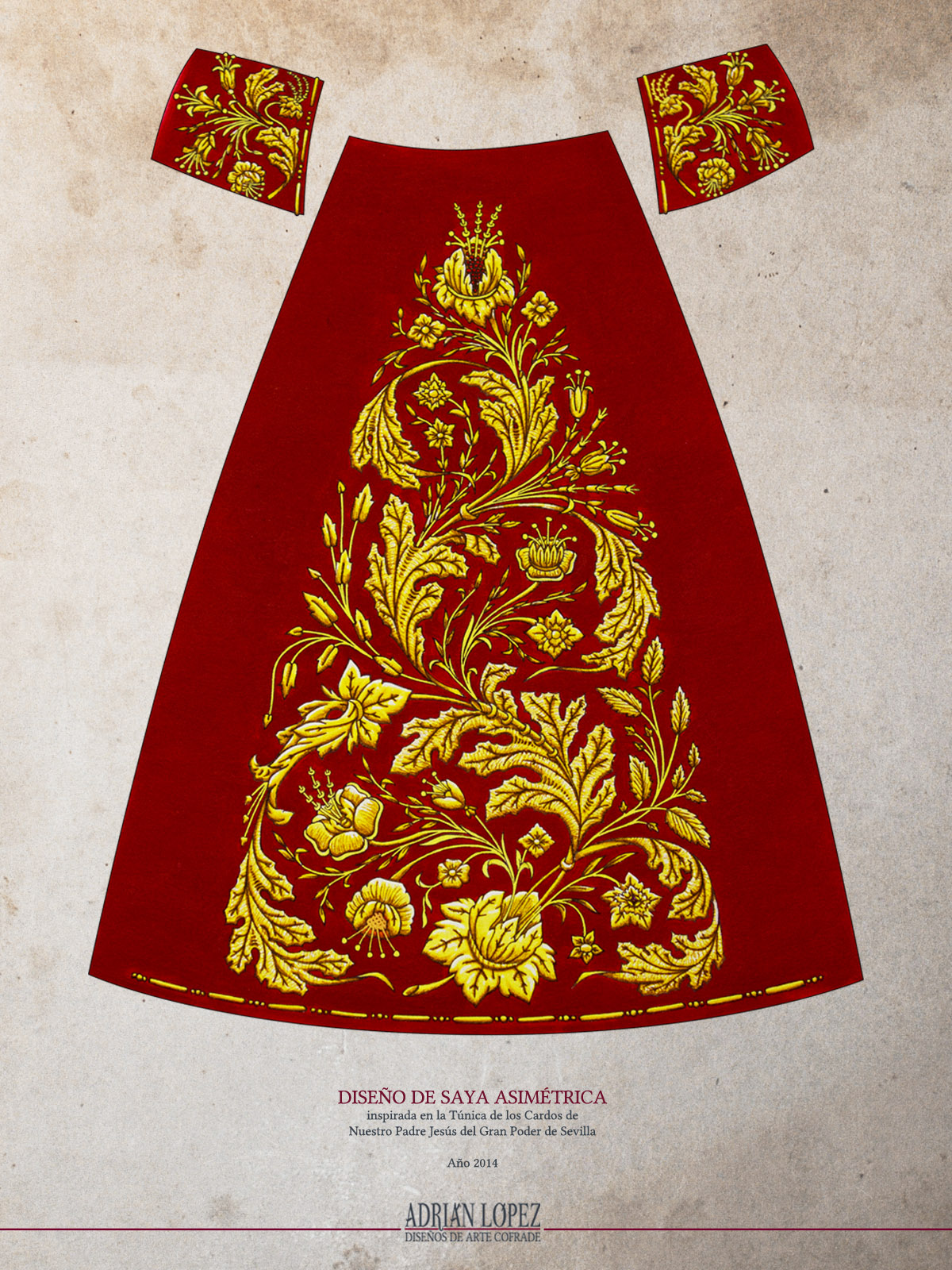 Realicé este diseño en el año 2014 sin un destino concreto, con el único fin de servir como estudio sobre el bordado decimonónico. Se trata de una saya asimétrica pensada para ir sobre terciopelo color burdeos, cuyo dibujo se inspira en una etapa del arte y la estética cofrades conocida como la “época romántica” y, en especial, en una de sus más brillantes realizaciones: la famosa Túnica de los Cardos que ejecutaran en 1880-81 las geniales bordadoras Ana y Josefa Antúnez para la veneradísima imagen de Nuestro Padre Jesús del Gran Poder de Sevilla, siguiendo el diseño de Emigdio Serano, por entonces prioste de la Hermandad. Se aprecia esta inspiración en las hojas de cardo que son el motivo principal de la composición, así como en el ritmo curvilíneo de los tallos, que da sensación de enroscamiento, y en la forma de algunas de las flores y tallos menores presentes en el diseño. Evidentemente, las similitudes se terminan aquí, siendo la pieza diseñada por mí, como no podría ser de otra forma, infinitamente más modesta y sencilla que aquella a la que se refiere, no en vano una de las obras más fastuosas y geniales que se han producido nunca en el arte del bordado en oro.