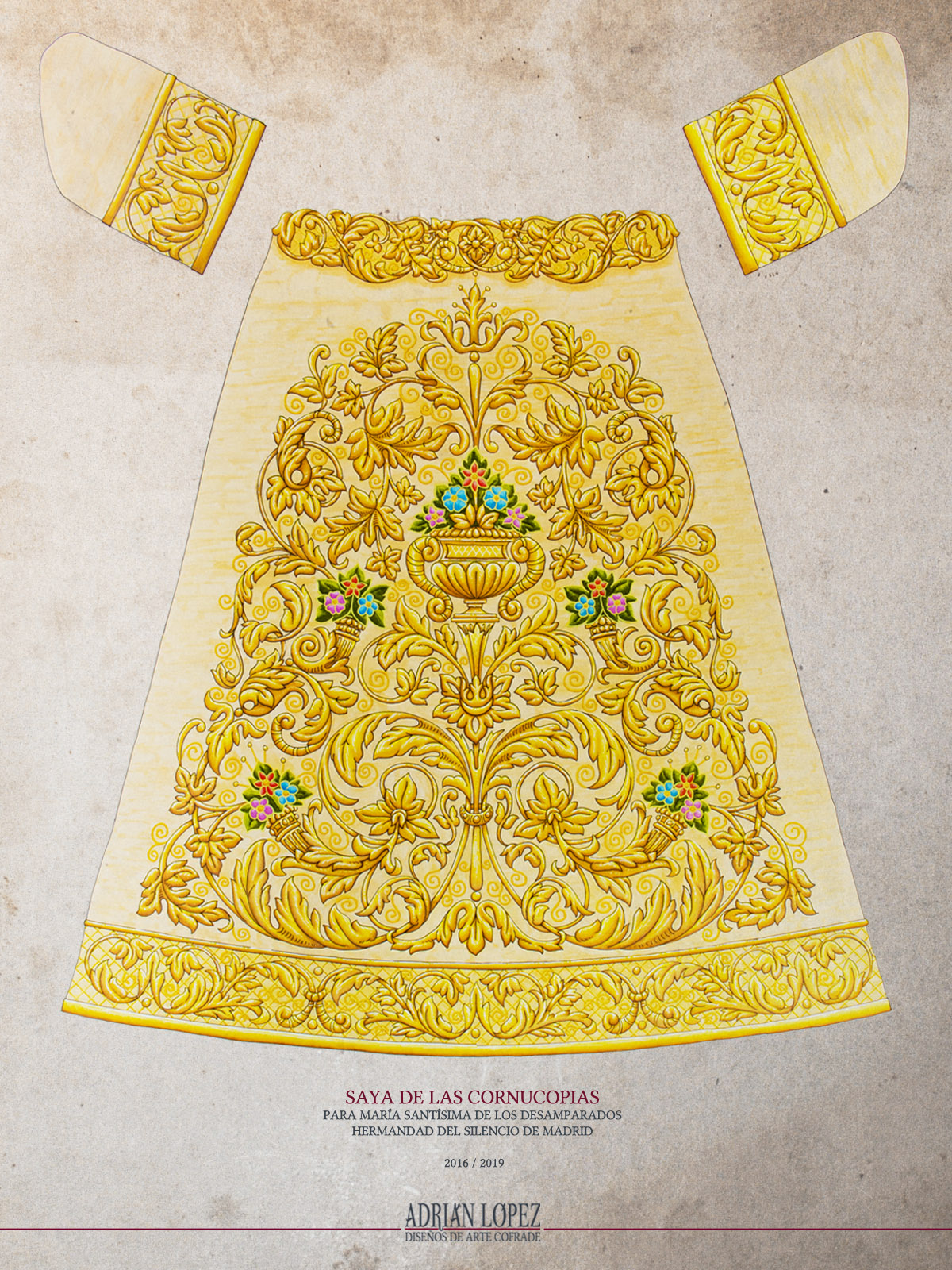 La idea de realizar una nueva saya para María Santísima de los Desamparados, titular mariana de mi querida Hermandad del Silencio de Madrid, surgió durante los primeros compases del proceso de ejecución del nuevo estandarte corporativo de la corporación, cuyo diseño tuve también el honor y el gusto de realizar, y que puede verse aquí. De hecho, el boceto original de esta saya lo hice prácticamente al mismo tiempo que el de la insignia, si bien se consideró oportuno que el taller de bordado propio organizado por la Hermandad comenzase su actividad centrándose en el bacalao, que era más urgente, y que la saya se abordase más adelante. Finalmente, el pasado año 2019 se pudo, por fin, acometer tan ansiado proyecto, que pronto dará sus frutos, ya que las labores de bordado de esta nueva saya, que será, de hecho, la primera saya bordada de su ajuar, están muy avanzadas en el momento de la publicación de esta entrada.