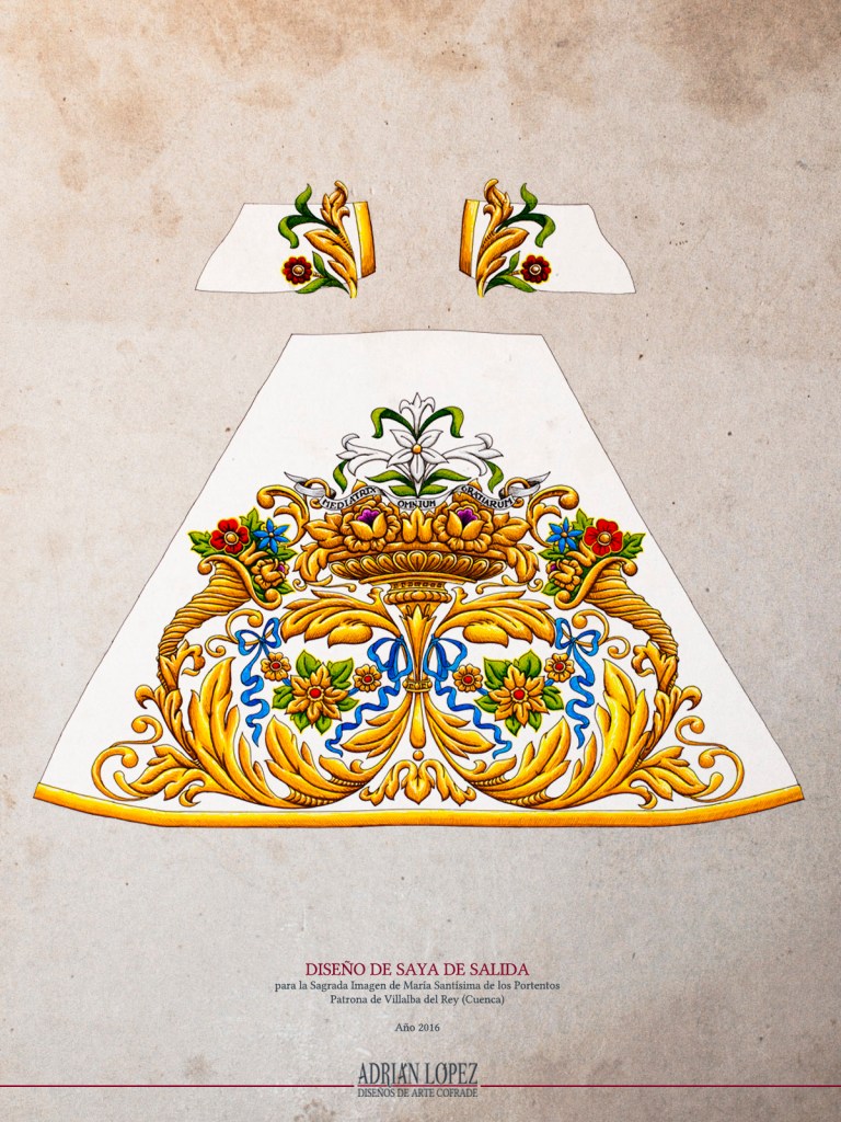 Pasada la Semana Santa de 2016, la Hermandad de la Virgen de los Portentos, Patrona de la localidad conquense de Villalba del Rey, se puso en contacto conmigo a través de la persona de Francisco Javier Moraleja Izquierdo, gran cofrade y erudito de la estética de la Semana Santa, al que me une una estrecha amistad. La idea que se me transmite es la de realizar el diseño de una nueva saya para la Sagrada Imagen, en principio para que sea ejecutado en la técnica de pintura en tela, pero que se pueda bordar llegado el momento, si la corporación dispusiera de fondos para ello. El soporte de la pintura sería una saya de damasco color crudo de la que disponía la corporación, y a la que se quería dar mayor realce.