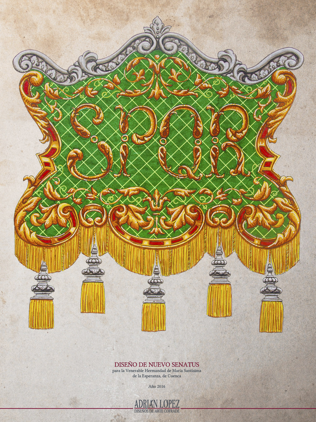 Este diseño, que se remonta a finales del año 2016, es uno de los primeros proyectos que tuve el honor de realizar para la Venerable Hermandad de María Santísima de la Esperanza, de Cuenca. En el seno de su Junta de Gobierno comenzaba entonces a gestarse la idea de una renovación estética y patrimonial que desembocaría, poco tiempo después, en la formación de un Taller de Bordado propio, del que hoy se puede decir que está plenamente consolidado, y es un orgullo para la corporación. Desde el primer momento, la Junta de Gobierno me planteó la necesidad de sustituir el antiguo senatus, una insignia emblemática dentro del cortejo de esta cofradía del Martes Santo conquense, por cuanto fue introducida en éste y, de hecho, en los desfiles pasionistas de la ciudad, por el añorado fundador de la corporación, el sanluqueño José María de Diego Lora. La pieza en cuestión tiene una escasa relevancia técnica, pero atesora un enorme valor histórico y sentimental para los hermanos y devotos de la Virgen de la Esperanza, por lo que la intención de la Junta de Gobierno era conservarla y, en su lugar, realizar una nueva que reuniera unos valores artísticos notables y fuera más acorde con el estilo que se quería dar al patrimonio de la corporación.
