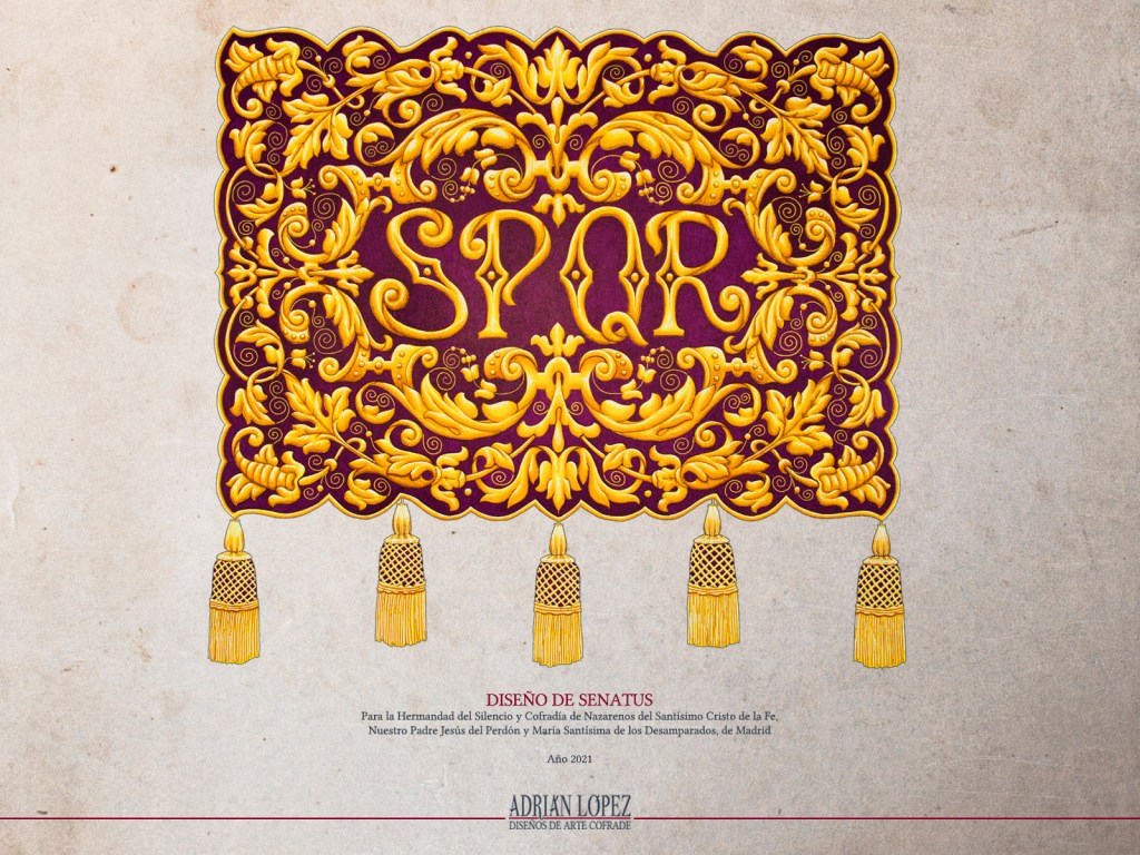 Una vez concluida la ejecución de la Saya de las Cornucopias para María Santísima de los Desamparados, la primera bordada del ajuar de esta dolorosa, de la que ya hablé en una entrada anterior, el taller de bordados propio de mi queridísima Hermandad del Silencio de Madrid optó por centrarse de nuevo en un proyecto que viniera a enriquecer el cortejo de la cofradía, acometiendo la hechura de una nueva insignia para el mismo. En este caso, se trata de una pieza muy popular dentro del ámbito cofrade, pero que esta corporación matritense nunca había tenido, como es el senatus, ese estandarte que ideara el gran Juan Manuel Rodríguez Ojeda para incluir en los cortejos de Cristo, y que rememora que los hechos de la Pasión, Muerte y Resurrección de Nuestro Señor Jesucristo tuvieron lugar bajo la dominación romana de Judea.