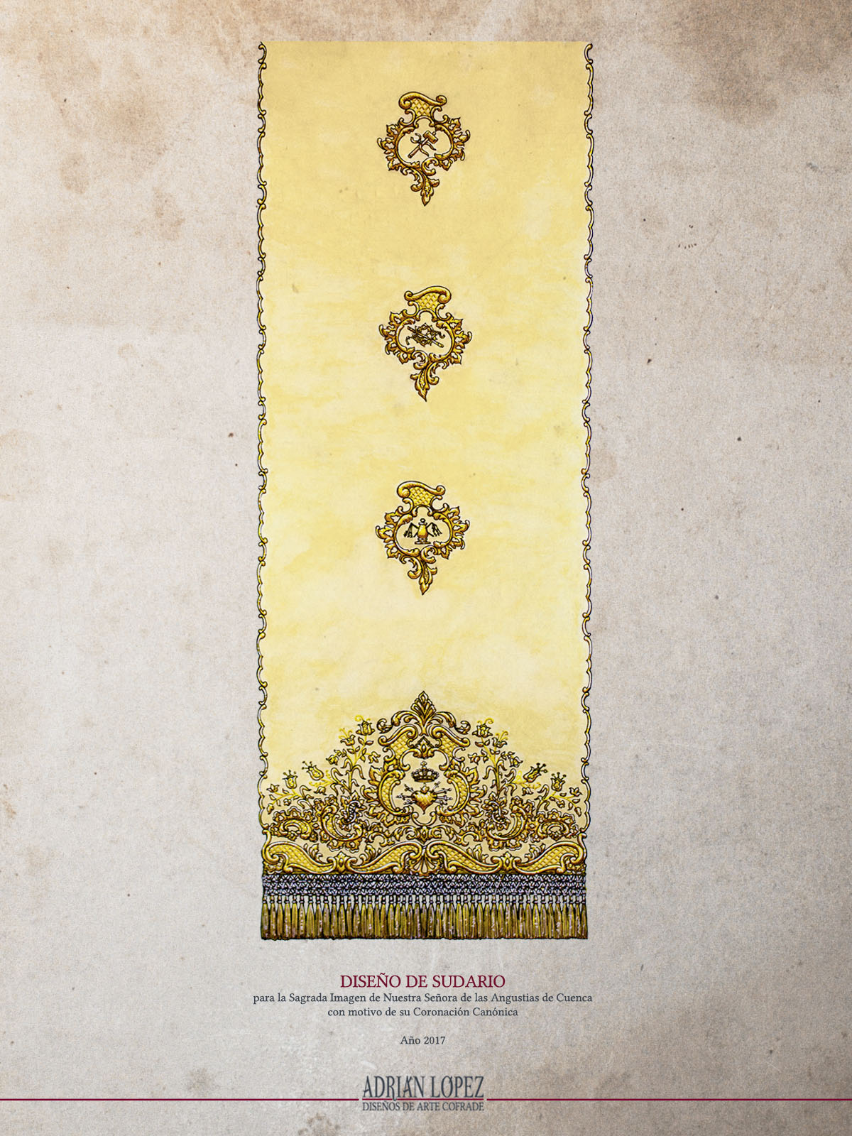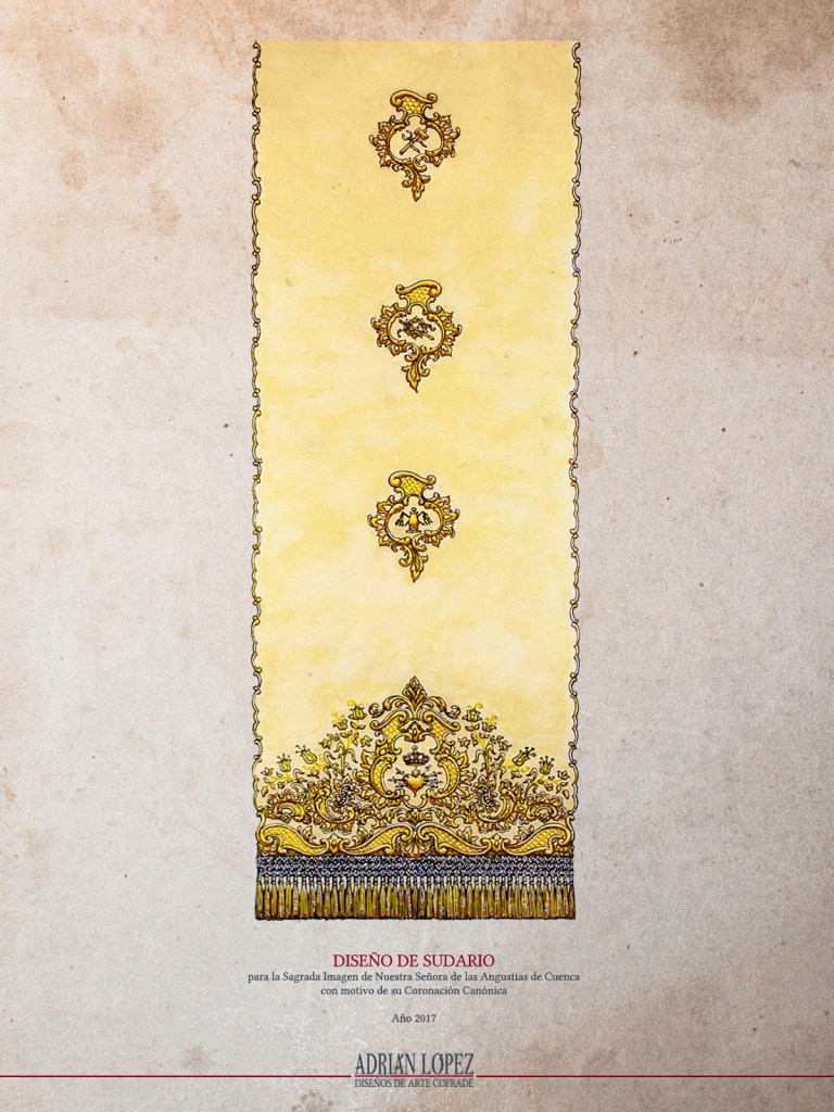 A principios del presente año 2017, el Mayordomo de la Venerable Hermandad de María Santísima de la Esperanza de Cuenca, José Manuel Calzada Valero, buen amigo y gran nazareno conquense pero, sobre todo, uno de esos cofrades que, afortunadamente, ha desterrado la palabra “imposible” de su vocabulario, se puso en contacto conmigo para comunicarme que las hermandades marianas de Cuenca tenían la voluntad de regalar a la veneradísima imagen de Nuestra Señora de las Angustias un sudario con motivo de su Coronación Canónica, que tendrá lugar el próximo 6 de mayo, y que habían pensado en mí para hacer el diseño. Como no podría ser de otra forma, fue para mí todo un honor que estas corporaciones contaran conmigo desde el primer momento, así que acepté inmediatamente el encargo, y me puse a trabajar con la voluntad de corresponder a la confianza que estas corporaciones estaban depositando en mí, con un diseño que respondiera plenamente a sus expectativas, y estuviera a la altura de las circunstancias.